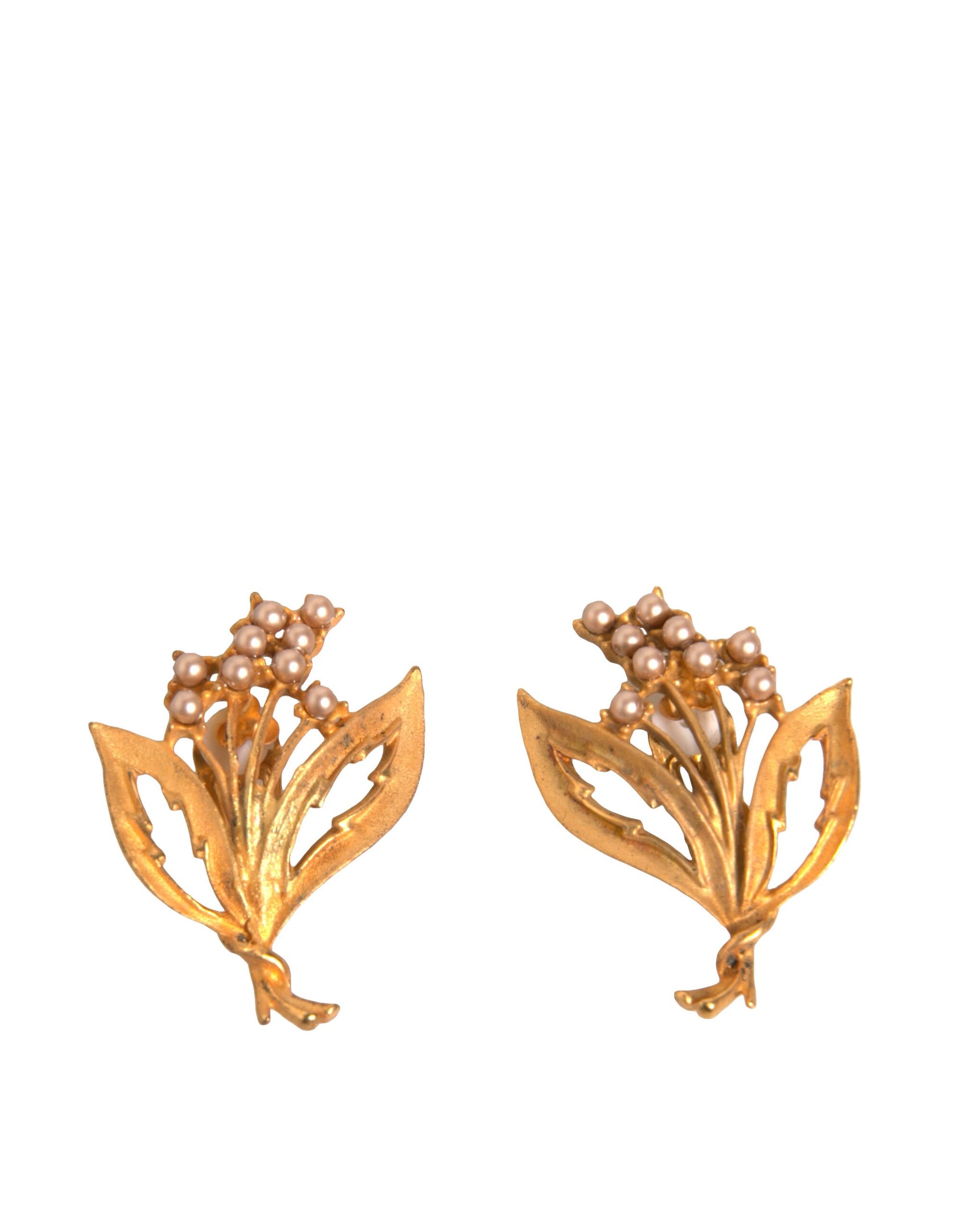 Gold Tone Brass Lily Of The Valley Pearl Clip On Earrings