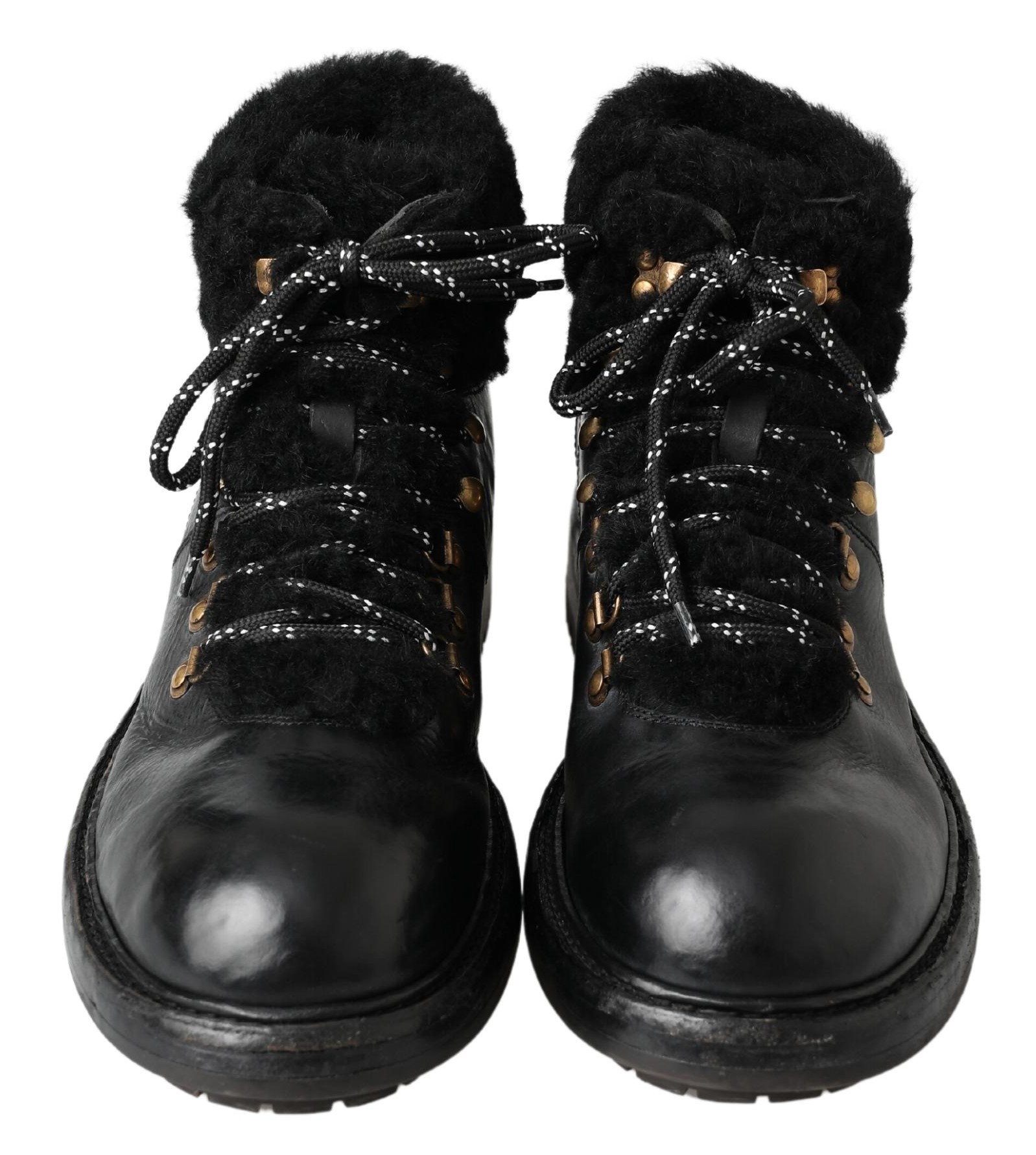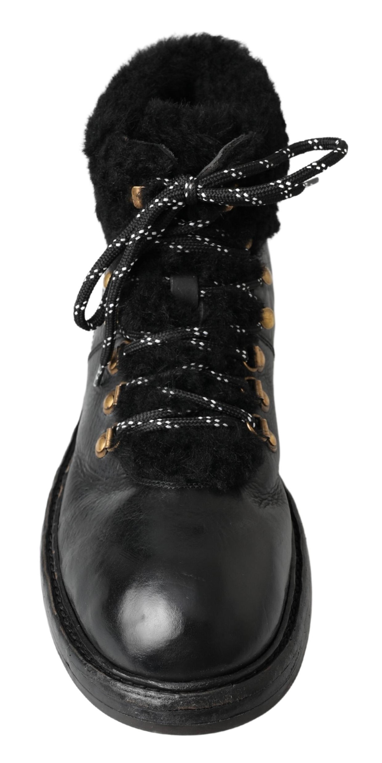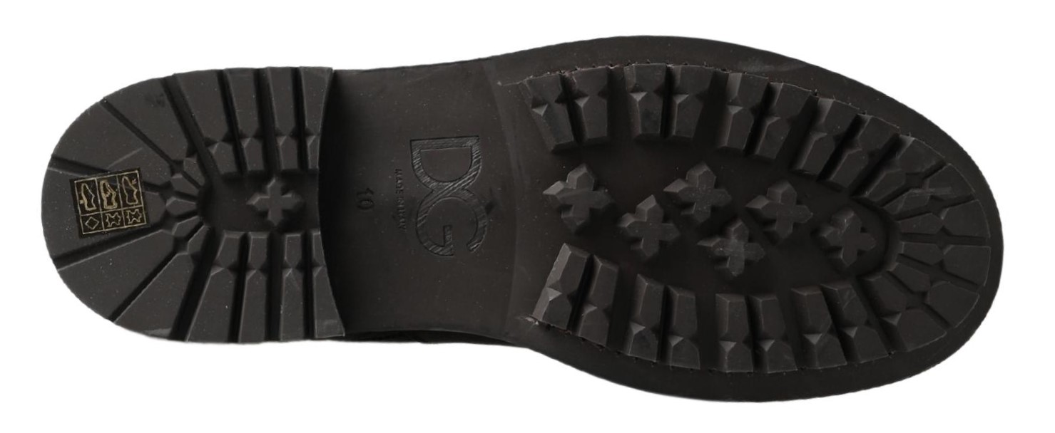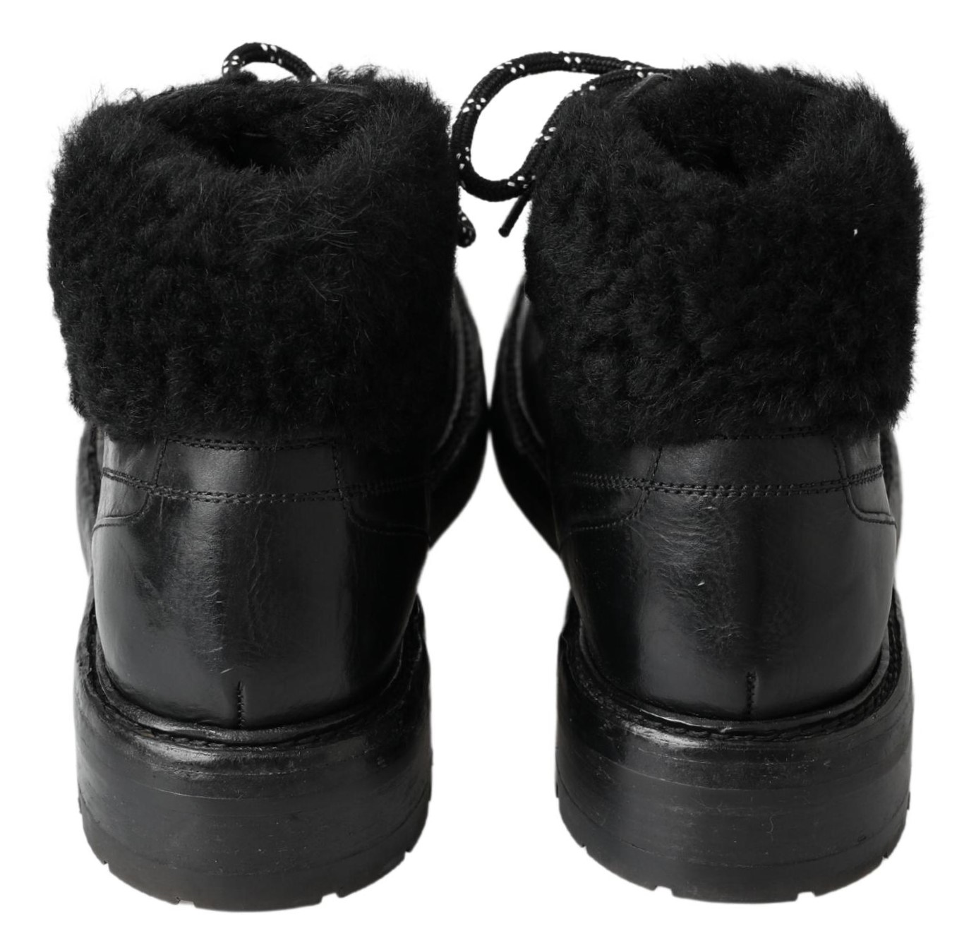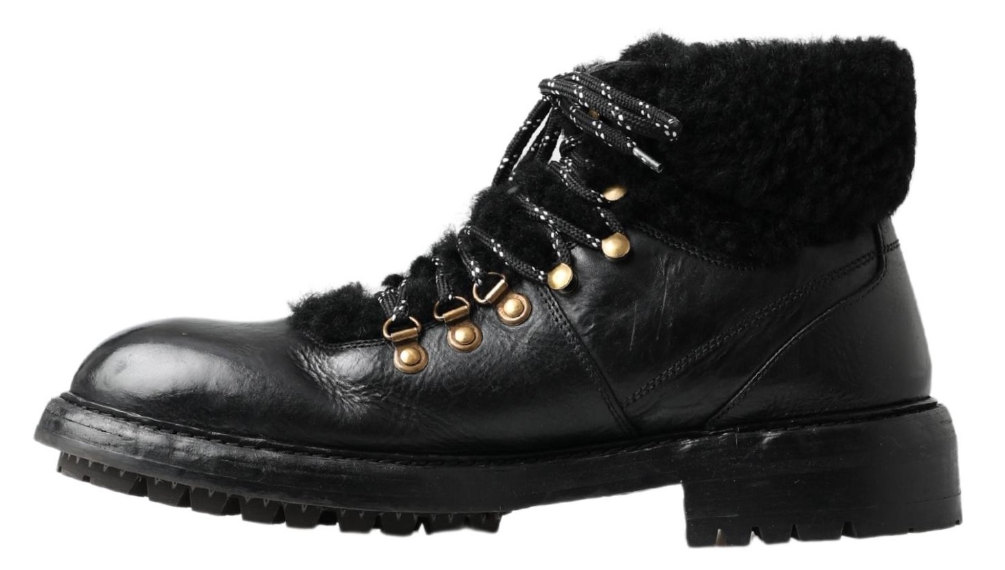 Indulge in the comfort and luxury of these exquisite men’s shearling style boots by Dolce & Gabbana. Crafted with precision and high craftsmanship in Italy, these boots are the embodiment of style and durability. Their sleek black leather construction paired with a sturdy rubber outer sole ensures a blend of elegance and practicality. The lace-up closure offers an adjustable fit while the subtle logo detailing adds a hint of designer appeal. These boots are not just an accessory, but a statement of sophistication for the modern man.
